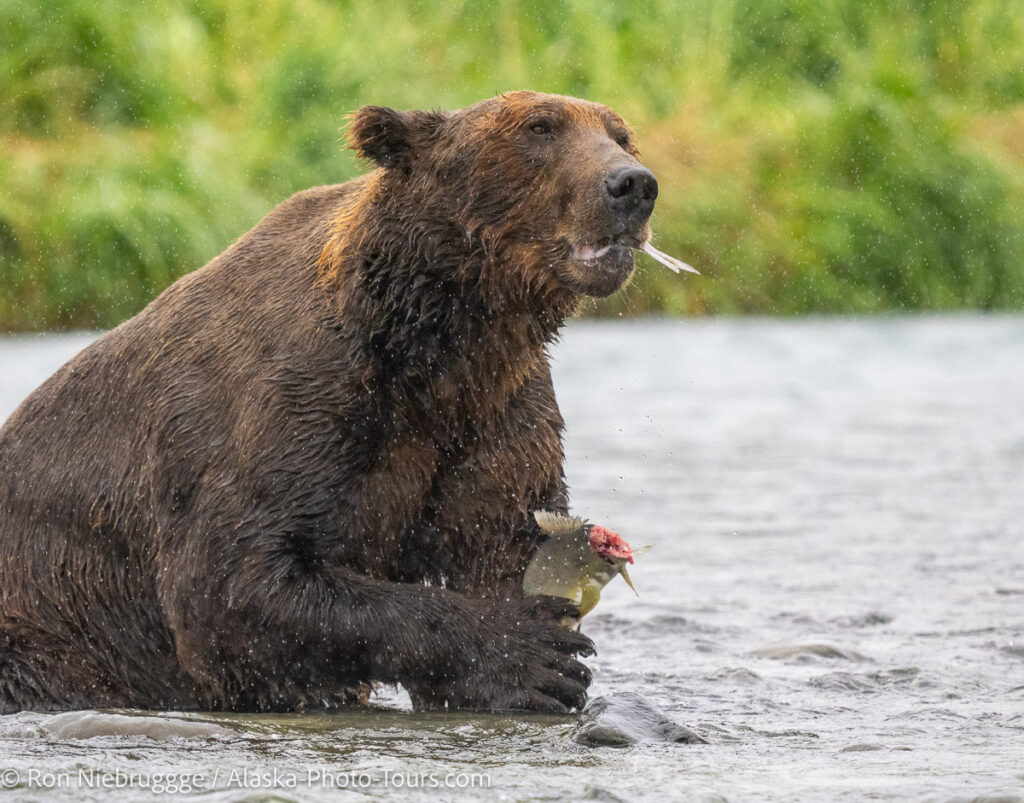 It is interesting how the bears on the Katmai Coast at the beginning of the Pink Salmon run start by eating the tail. I had just come from Southeast Alaska where the salmon run is earlier, and there the bears were already down to just eating the roe from females and throwing everything else back.
