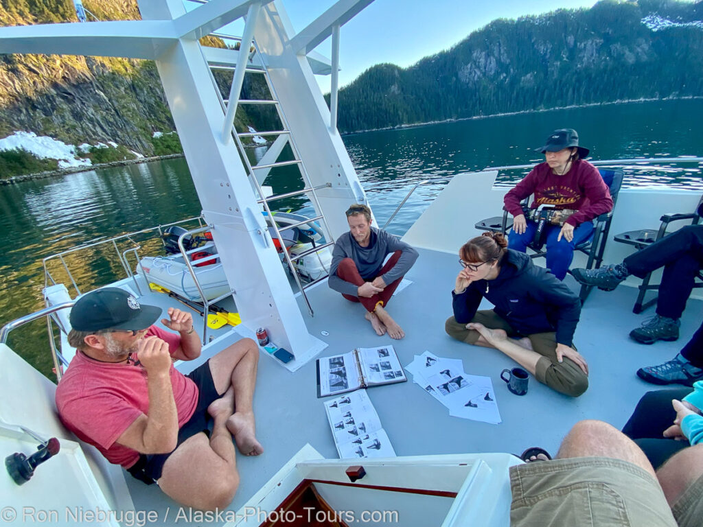 On our last night in the bay with orcas, local orca researcher Dan Olsen and two researchers from the San Juans boated over and explained their ongoing research project. Then, later that evening, my buddy Dan paddled over in his kayak with his id books and gave us a master class on the resident orcas of Southcentral Alaska! It was so cool to be there with Dan as orcas swam by and have him show us the id photos in the book and provide the history! Everyone loved the experience, especially me! Here is much more info on Dan’s orcas research; North Gulf Oceanic Society.