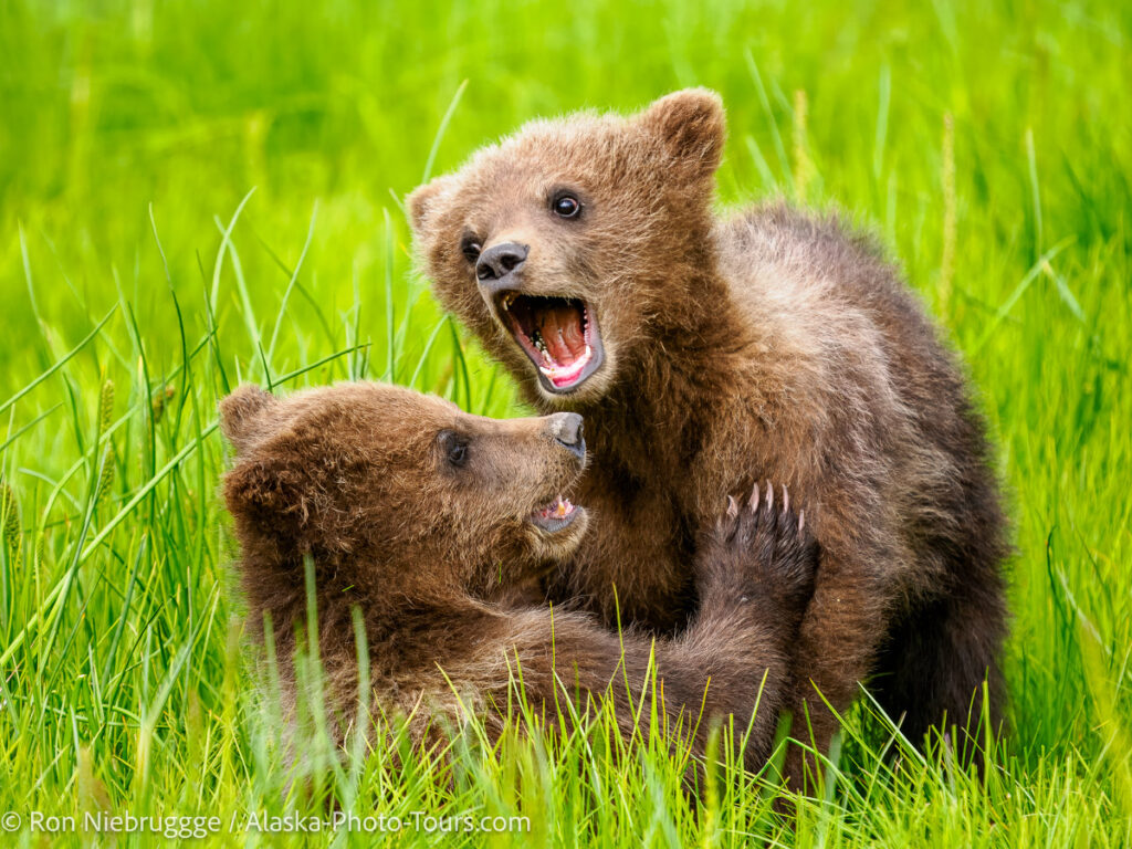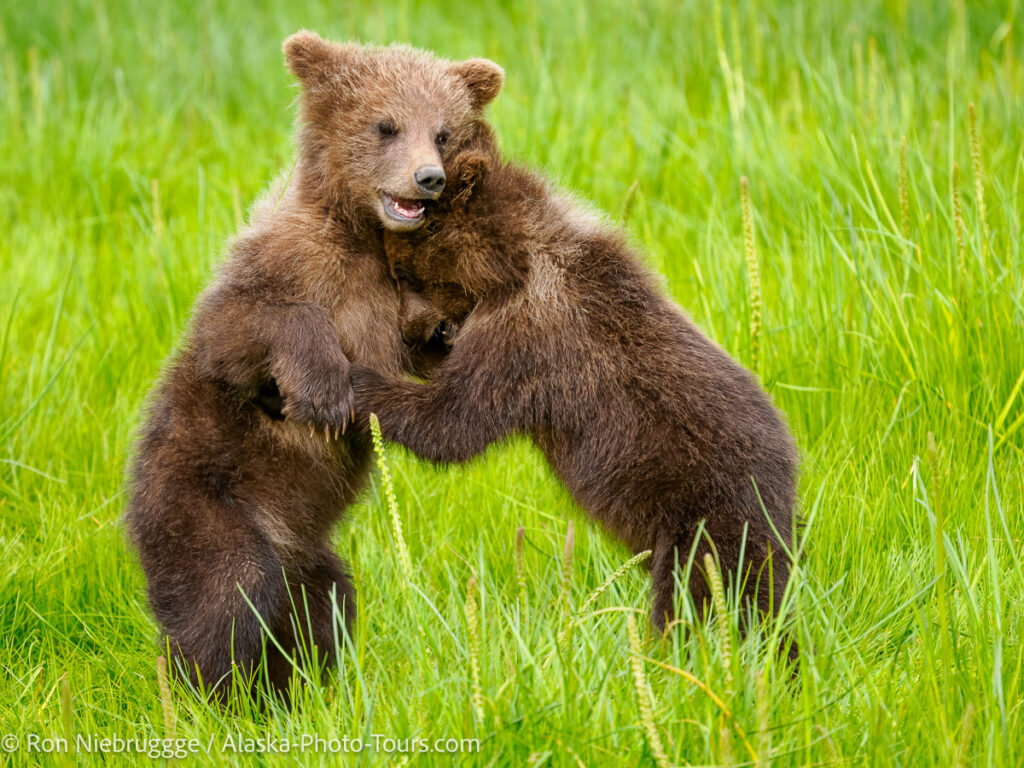 A couple cute little brown bear cubs playing in Lake Clark National Park, Alaska.
