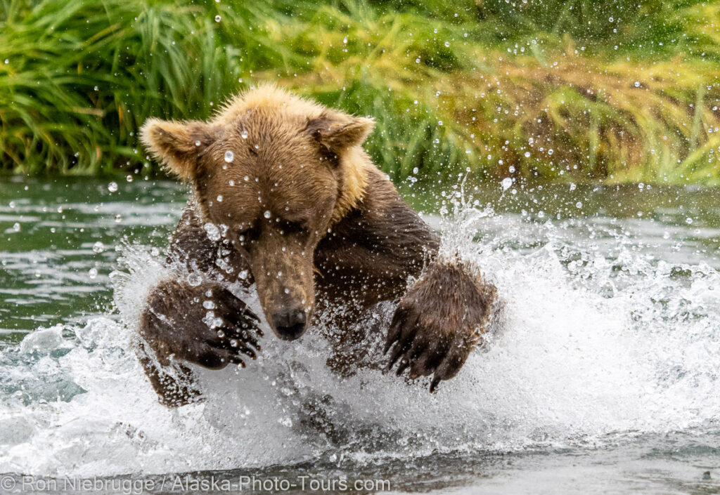 Brown bear chasing a salmon, Katmai National Park, Alaska.
