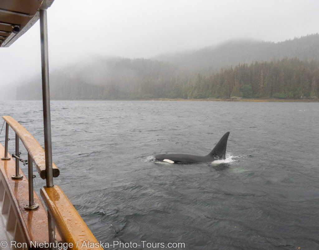 One member of a large pod of orcas coming by to check out the boat during my Bear and Whale trip. Nice to have covered walkways on those rainy days.